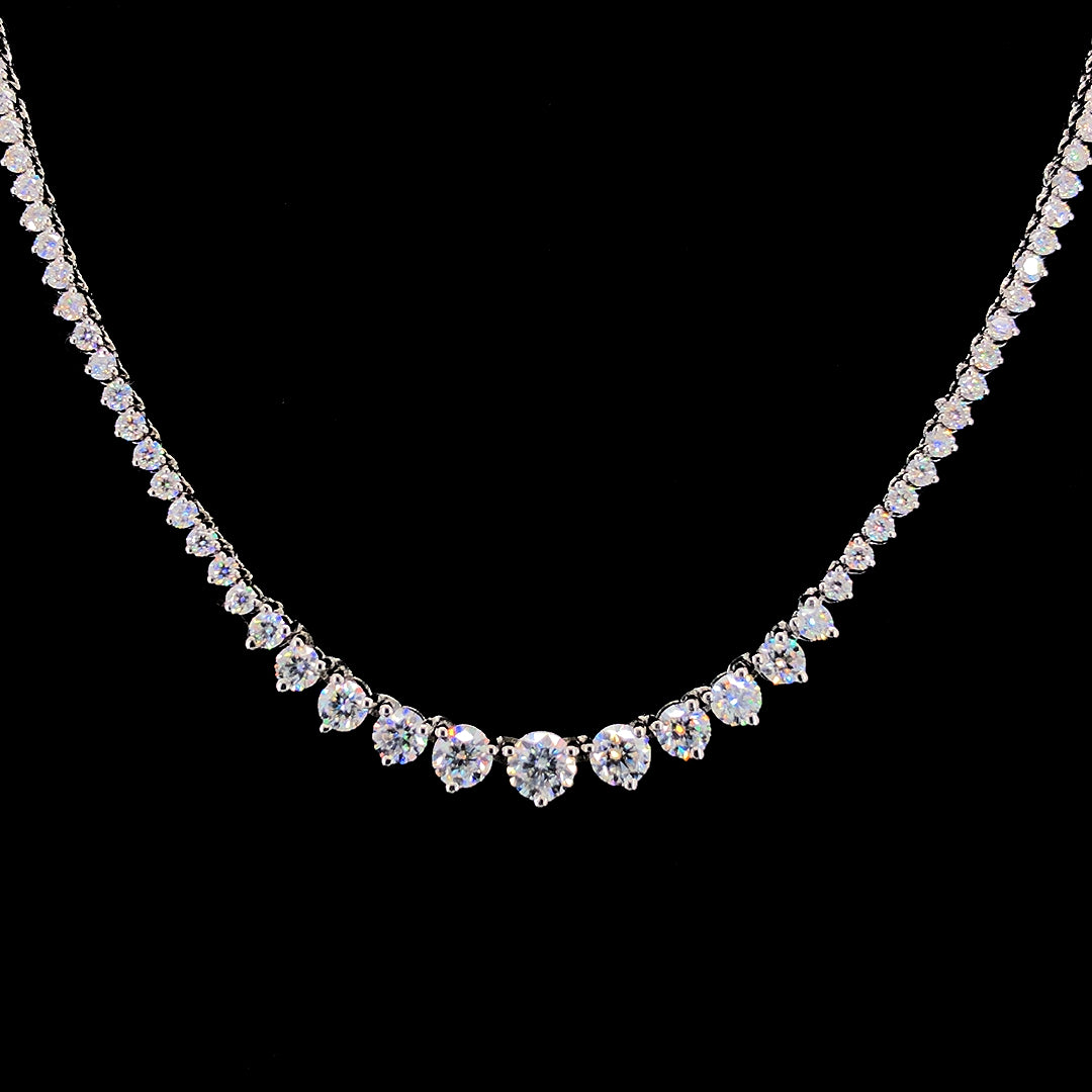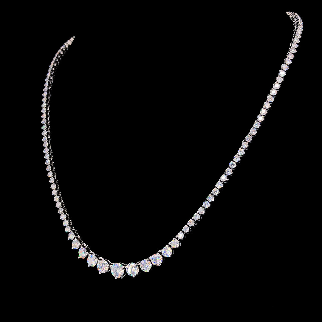 A journey of sparkle. Our necklace features 138 round cut moissanite diamonds, gracefully ascending along a sterling silver chain. Each stone catches the light, creating a stunning, upward flow of brilliance, perfectly designed to elevate your style.