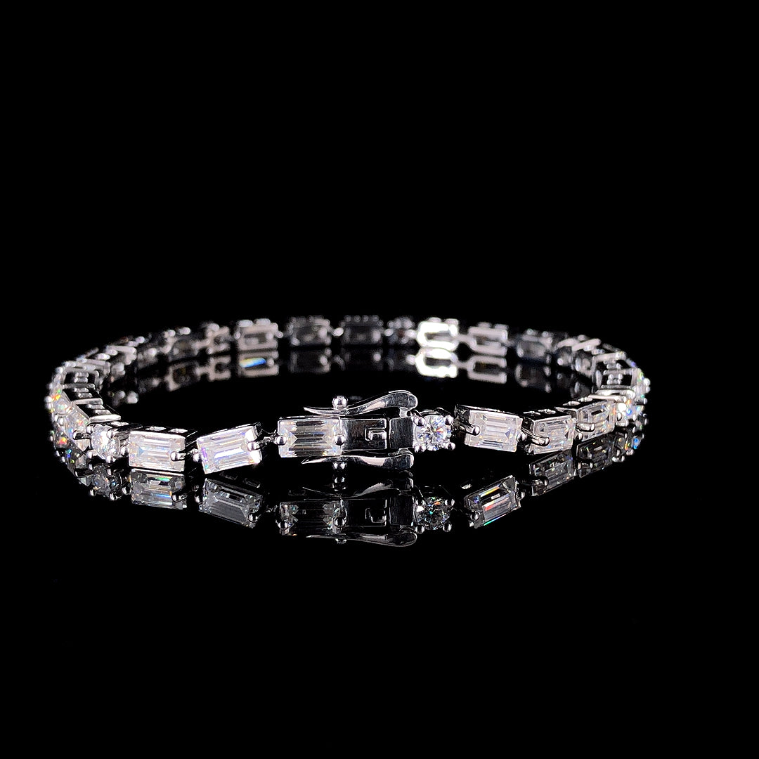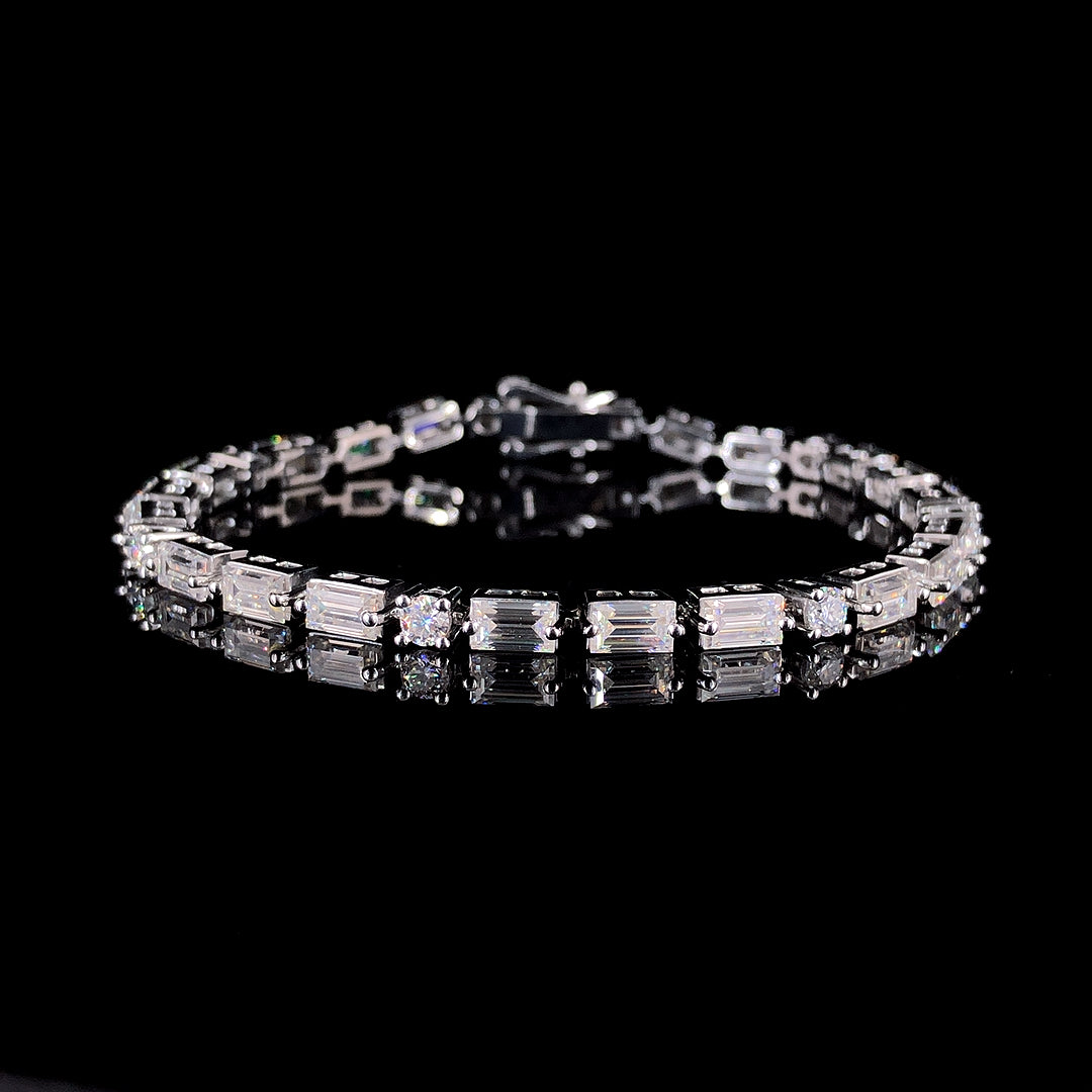 a refined fusion of clean geometry and classic brilliance Crafted in 9.05 grams of 925 sterling silver this bracelet features a striking pattern of 35 diamonds alternating between baguette and round cuts. With a total diamond weight of 7.52 carats the design creates a rhythmic sparkle that’s both modern and timeless Sleek balanced and versatile the BAGUETTE X ROUND TENNIS BRACELET brings understated luxury to every look.