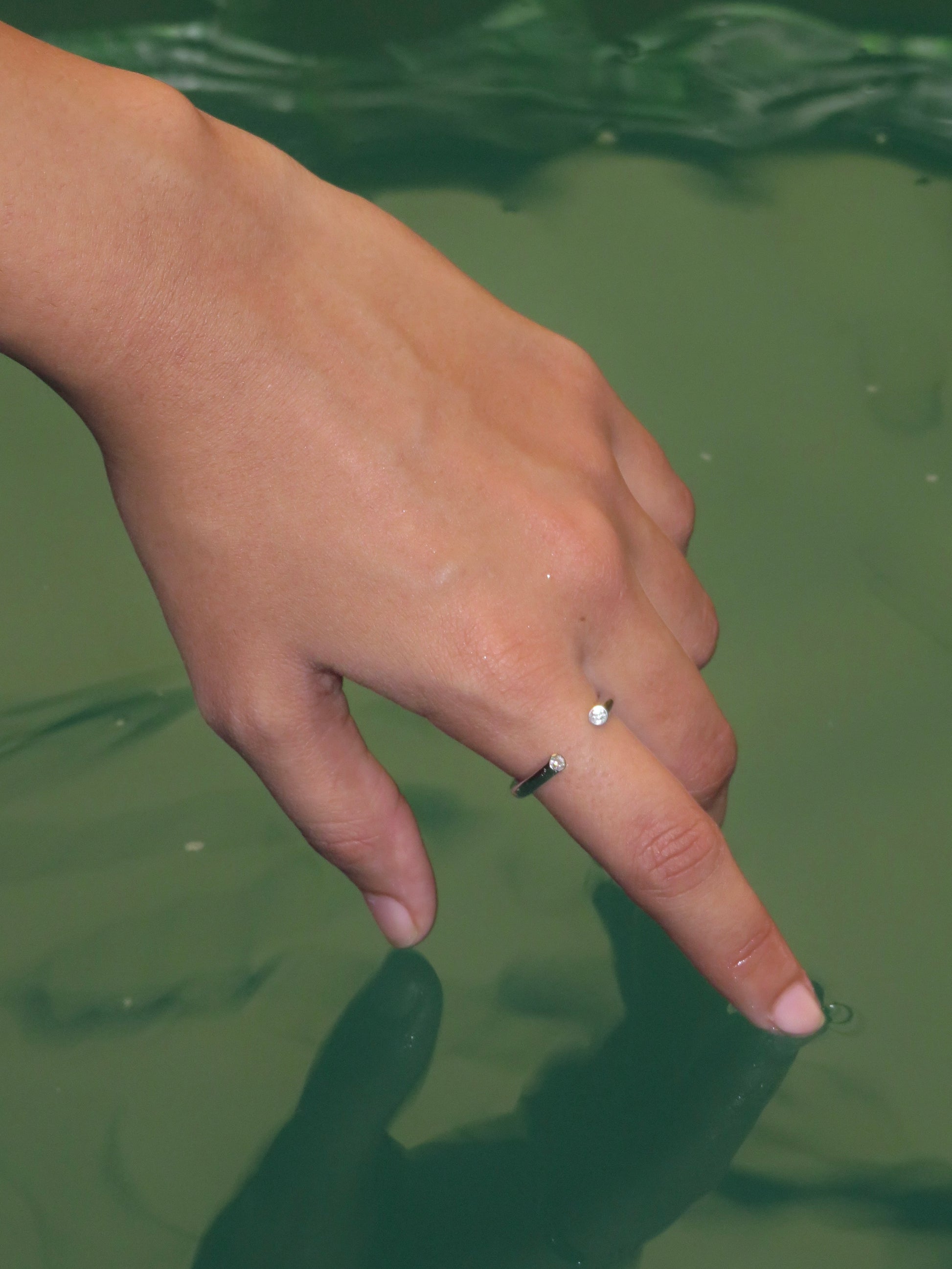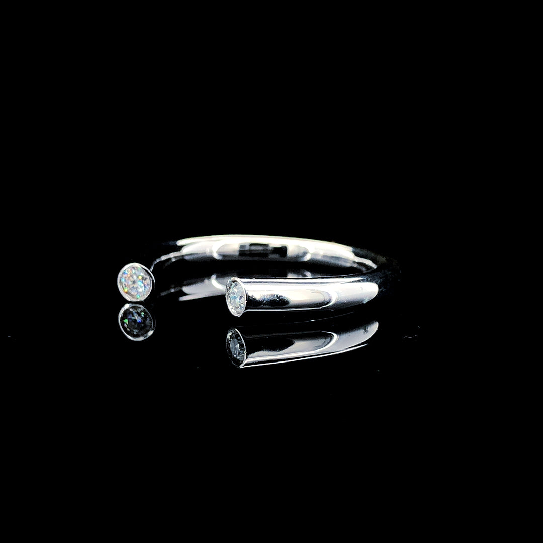 A minimal yet powerful design inspired by celestial alignment Crafted in 2 grams of 925 sterling silver this piece features 2 round cut diamonds positioned at the edges of a delicate open curve With a total diamond weight of 0.10 carat the stones appear to almost meet across the gap symbolizing connection through space and form The subtle break in the design creates tension and harmony echoing the beauty of an eclipse refined to its simplest most luxurious form.
