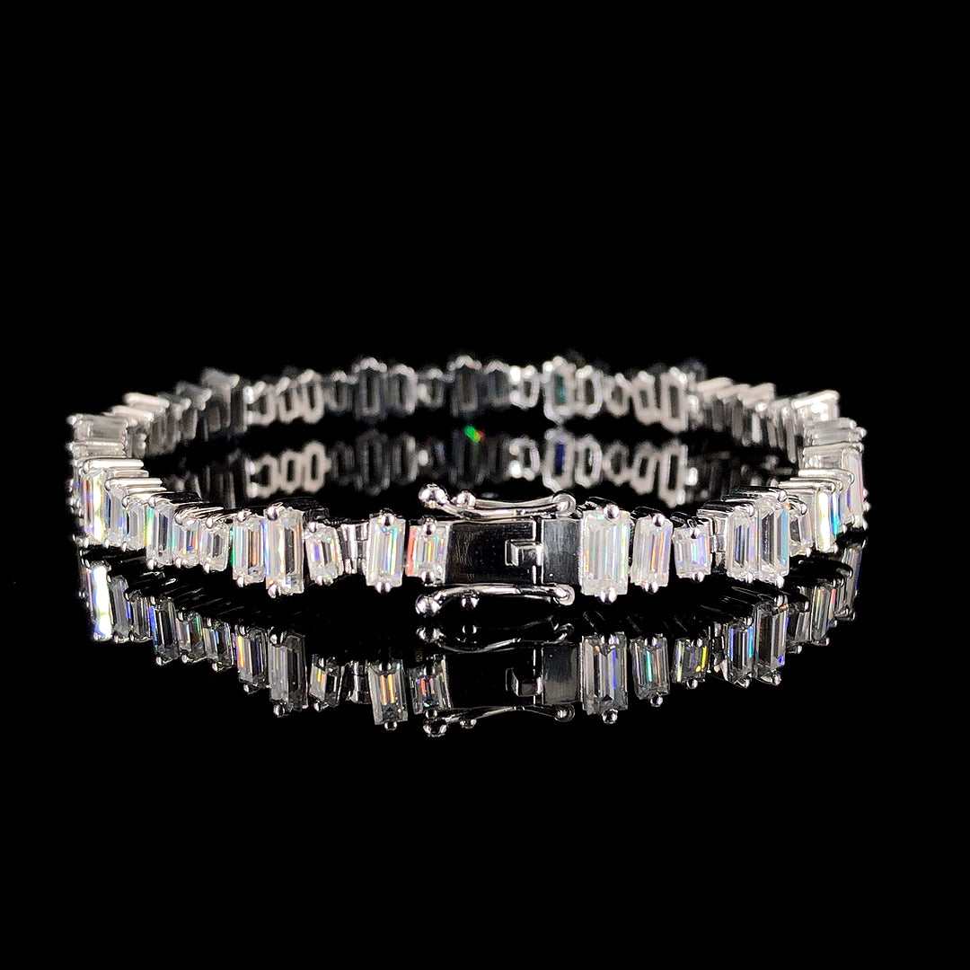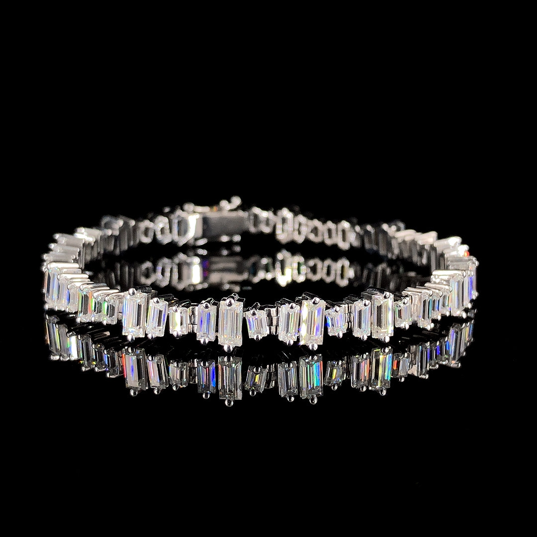 A sharp and structured piece with a bold identity crafted in 15.98 grams of 925 sterling silver this bracelet features 43 baguette cut diamonds set in a clean linear sequence With a total diamond weight of 7.80 carats each stone adds to the striking geometry of the design The GLITCH BAGUETTE TENNIS BRACELET offers a distinctive edge while keeping the form sleek and refined perfect for those who prefer detail with definition.