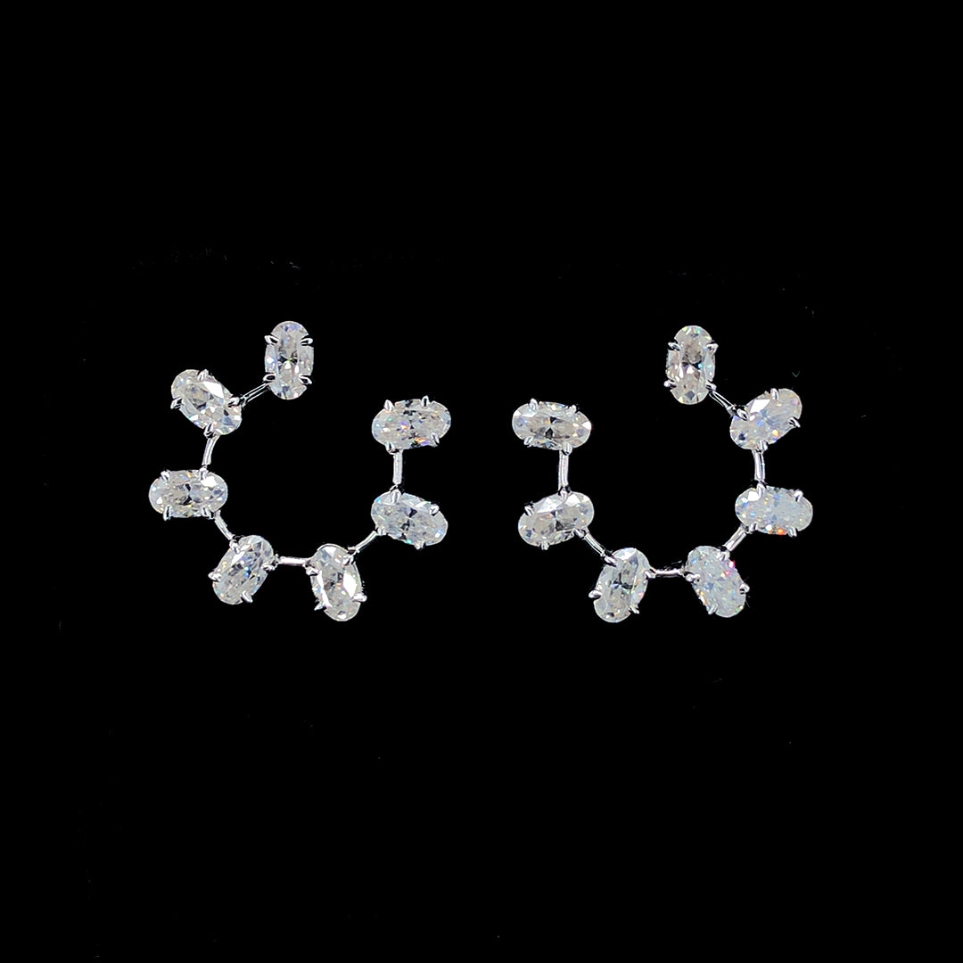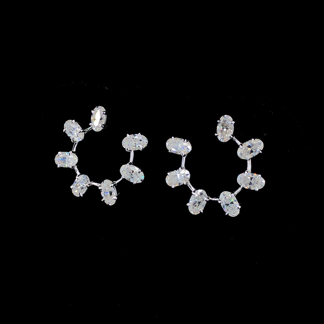A unique and minimal design that stands out with quiet confidence Crafted in 2.8 grams of 925 sterling silver this piece features 14 round cut diamonds set within a clean diamond shaped loop With a total diamond weight of 2.54 carats the stones are arranged to highlight the shape while keeping the design light refined and versatile The LOOP EARRING is made for those who appreciate detail without excess and elegance in its purest form