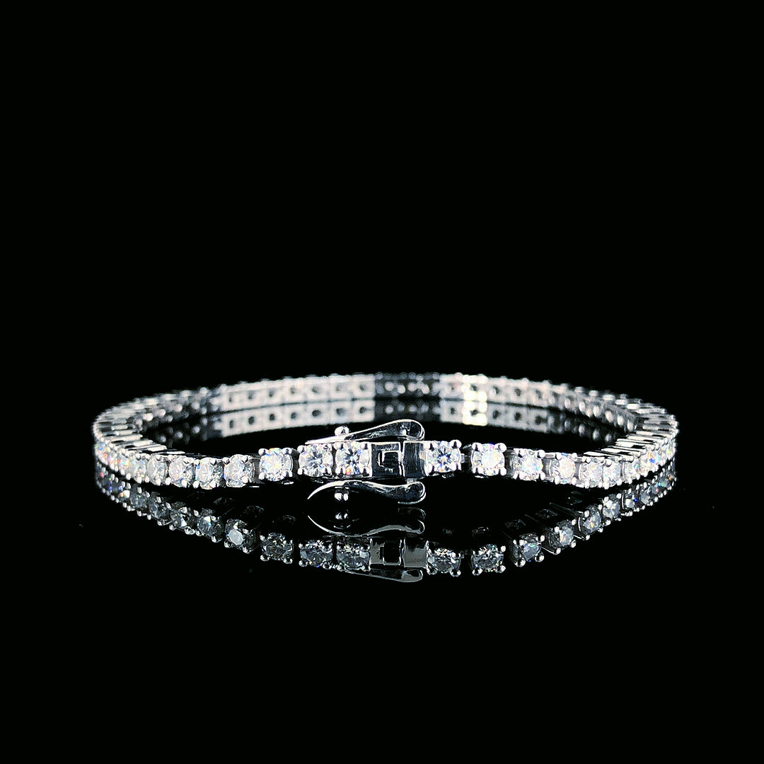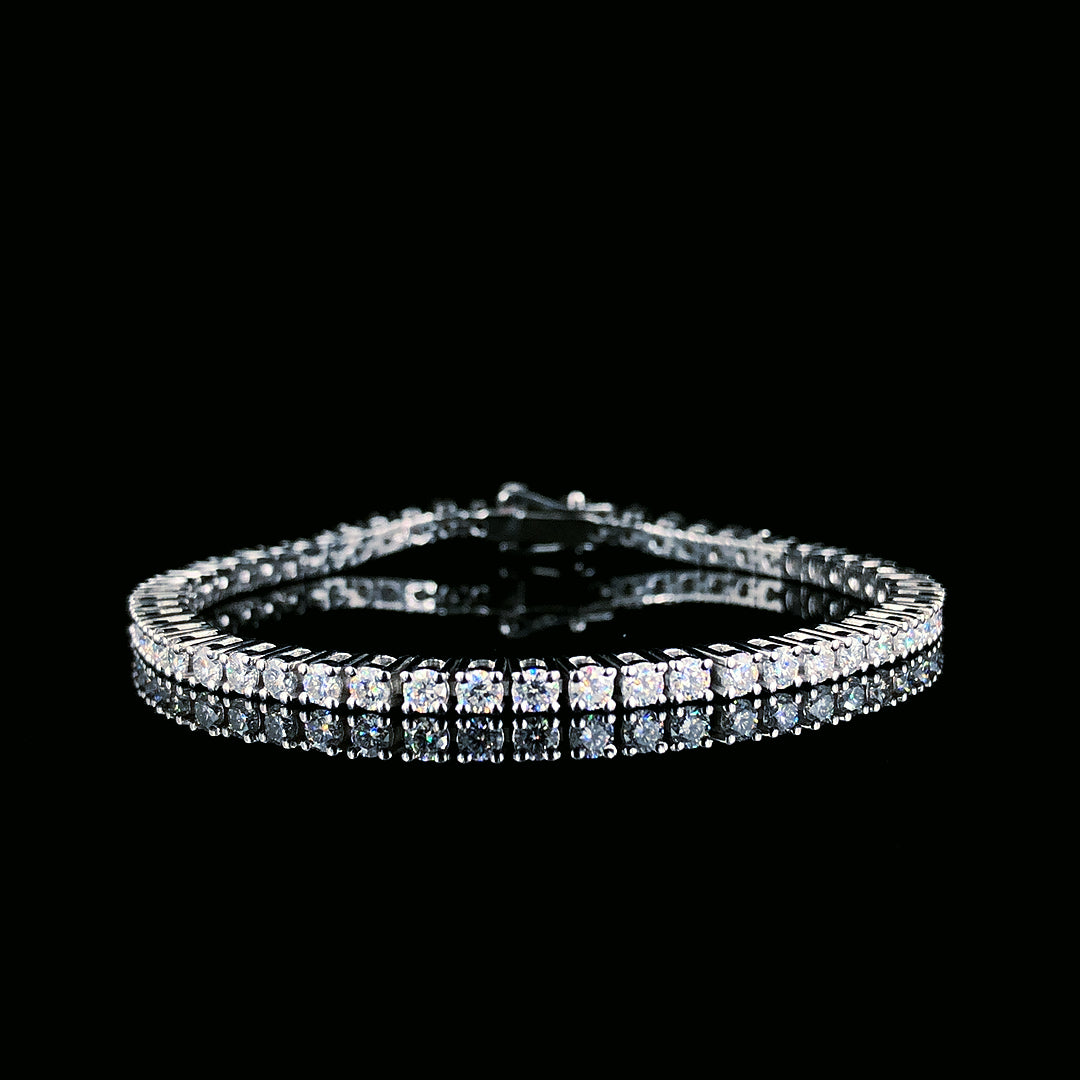 Crafted for clean structure and everyday shine Made in 10.29 grams of 925 sterling silver this bracelet features 51 round cut diamonds set in perfect alignment to create a fluid line of brilliance With a total diamond weight of 2.99 carats each stone is precisely placed for a bright refined finish The ROUND CUT TENNIS BRACELET is a sleek essential from the IZEL collection designed to elevate any look with ease.